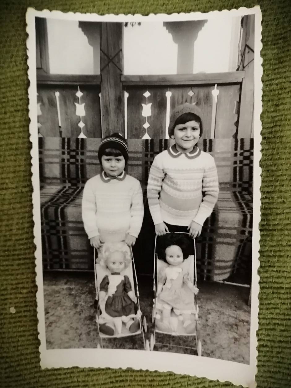 P.S.: În fotografie, două fetițe fericite, cu primele lor păpuși în căruț (și tunsoarea castron, la modă pe atunci, care se poate întrezări de sub căciuli)